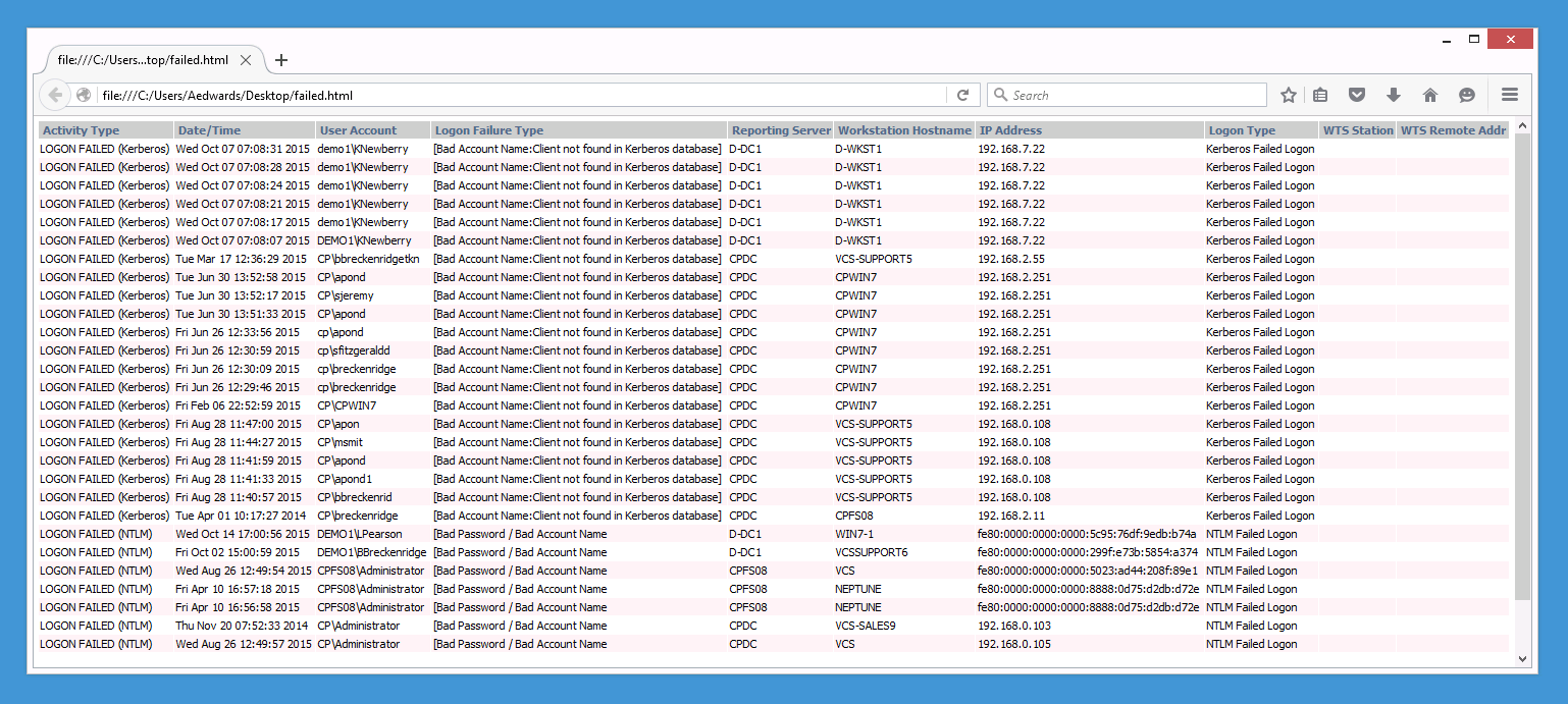 CPTRAX can record logons and logouts occurring within your Windows and Windows Terminal Server (Citrix) servers. Track failed logon attempts including those using an incorrect password as well as those using a non-existent account. The failed logon name, error type, IP address and workstation name are all recorded. Failed logons can be separately track based upon the originating IP address.